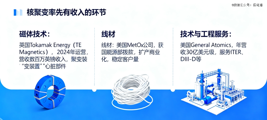 虽然距离“卖电”还很远,但是,这并不意味着没有赚钱机会。事实是:不少公司已在核聚变上有收入了,尤其是新材料、核心零部件环节。